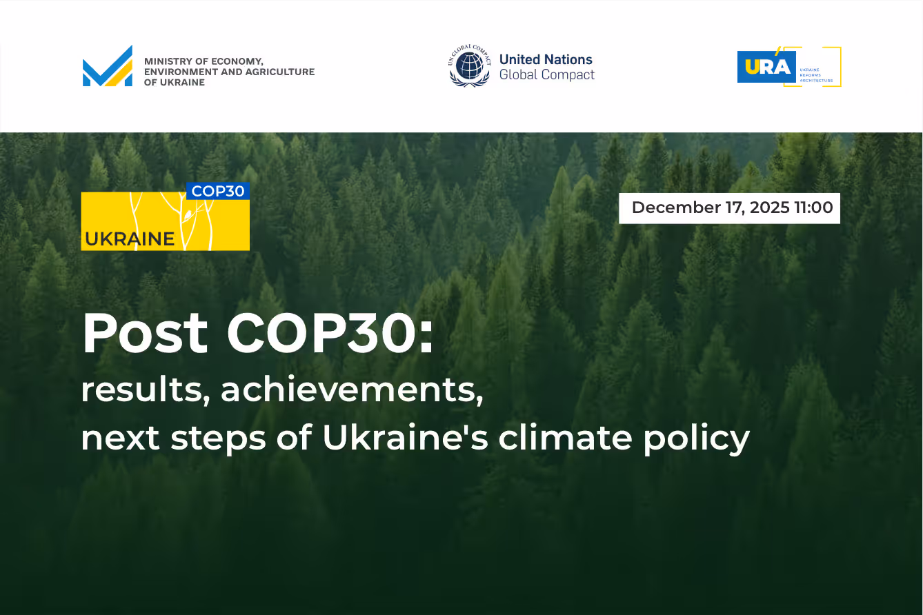 The event ‘Post COP30: Results, Achievements, Next Steps for Ukraine’s Climate Policy’ is organised on the initiative of the Ministry of Economy, Environment and Agriculture of Ukraine with the support of the UN Global Compact in Ukraine and the Architecture for Recovery and Reforms in Ukraine (URA).